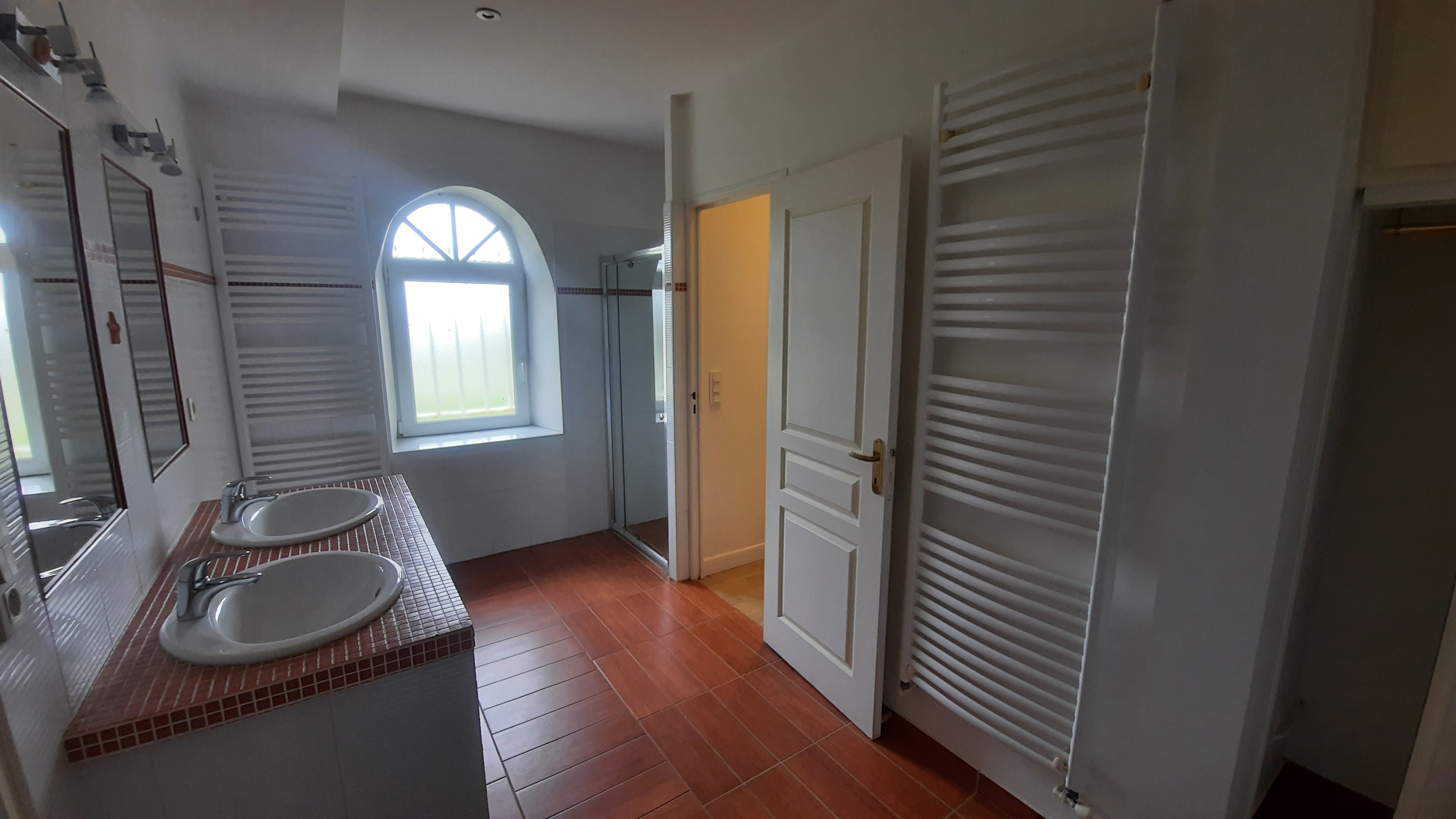 Salle de bain (11 m²) équipée d’une baignoire, d’une douche, d’une double vasque, et de deux grands sèche-serviettes