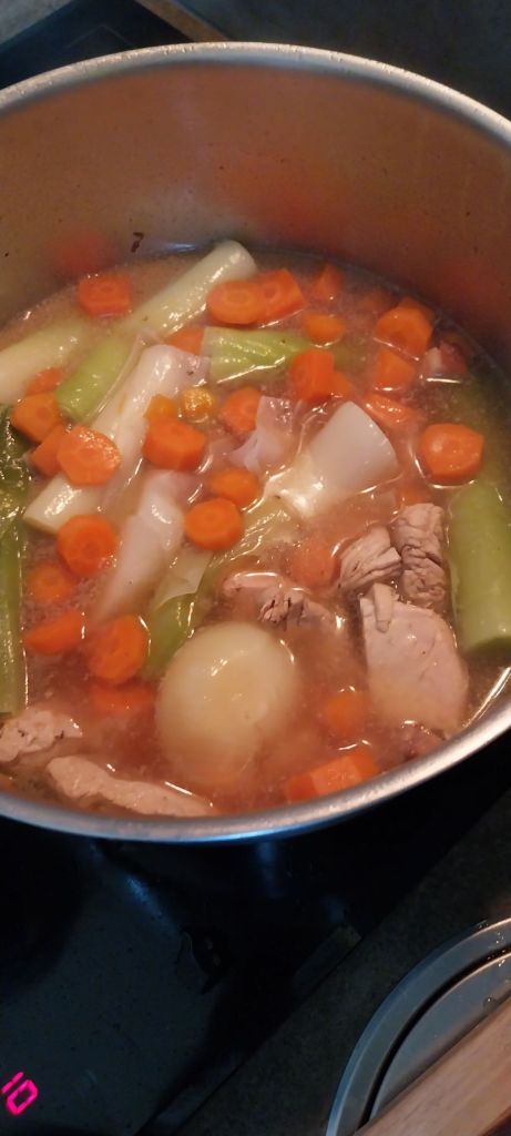 Placer oignon, carottes et poireaux, ajouter bouillon kub bouquet garni, ajouter eau qui ne recouvre pas complètement